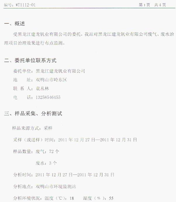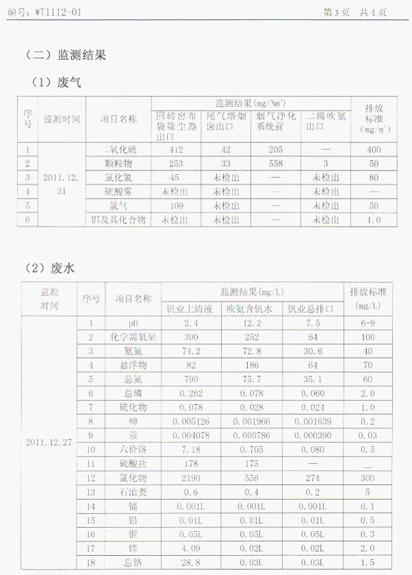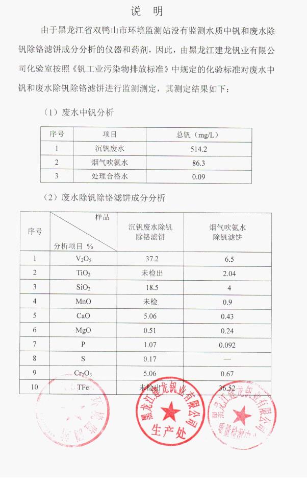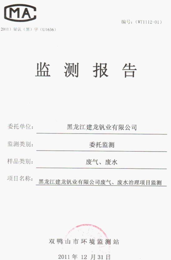 黑龍江建龍釩業(yè)有限公司5000噸V2O5廠的沉釩廢水釩鉻治理——煙氣吹氨達(dá)標(biāo)工程于2011年12月竣工正式投產(chǎn),并于2011年12月順利通過(guò)業(yè)主方組織的按GB26452-2011 釩工業(yè)污染物排放標(biāo)準(zhǔn)規(guī)定的項(xiàng)目環(huán)保達(dá)標(biāo)監(jiān)測(cè),工程已完成工程驗(yàn)收。