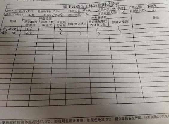 根據(jù)區(qū)政府要求,川藍(lán)鼎迅速對春節(jié)期間離攀員工進(jìn)行了全面排查,對員工春節(jié)期間的外出動向和外來人員接觸情況都明確、詳細(xì)的登記在案。對員工身體狀況,公司力求做到隨時了解員工身體狀況,調(diào)往脫硫的員工每日跟隨脫硫班組檢測體溫等身體狀況,留守粉線的人員也與脫硫班組完全同步檢測。