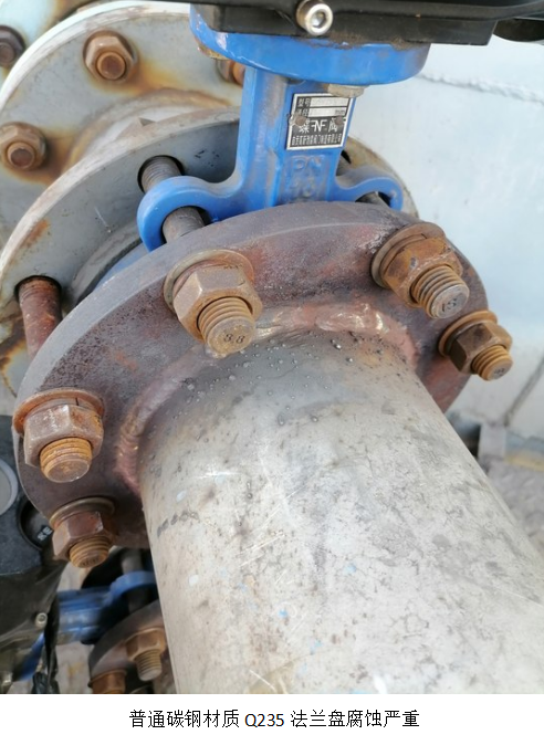 西昌藍鼎一、二期脫硫脫硝系統(tǒng)已經(jīng)連續(xù)運行了兩年,脫硫脫硝出口指標達到國家超低排放標準。但是部份機電設(shè)備腐蝕嚴重,比如主副塔的除霧器沖洗水管道法蘭盤材質(zhì)為普通碳鋼Q235,有部分法蘭盤已經(jīng)出現(xiàn)漏水故障,水噴到電機上可能將電機燒壞,跑冒滴漏也會被罰款,存在安全隱患。