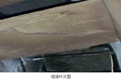 由于諸多問題處理存在交叉干擾,對于增壓風(fēng)機的處理放在了最后時段,當(dāng)日17:30 風(fēng)機停止運行,經(jīng)檢查發(fā)現(xiàn)風(fēng)機葉片結(jié)垢(質(zhì)地堅硬的NH4HSO4晶體,其硬度估算為25R以上)相當(dāng)嚴(yán)重,如果采取揭蓋方式處理至少還需要10h以上才能完成(超出預(yù)定時間4h),隨后孫小剛副總經(jīng)理和王建勇部長實地觀察分析后召集檢修班召開現(xiàn)場研討會,在保證不超時又必須處理的背景下果斷決定嘗試?yán)孟窜嚈C對風(fēng)機葉片(共25葉)進行沖洗檢修。由于風(fēng)機輪轂位置空間相當(dāng)狹窄,檢修人員需強忍高壓水沖洗時的大量酸性水溶液噴濺于面部的巨大困難連續(xù)輪番作業(yè)5小時,于23:30完成檢修任務(wù),處理的結(jié)垢物質(zhì)估算150Kg左右(風(fēng)機葉輪動平衡指標(biāo)一般為:偏心量50g以下)。經(jīng)增壓風(fēng)機啟機運行24h后發(fā)現(xiàn)諸振動值正常(最高值<1.2,幾乎與新風(fēng)機同等),完成了幾乎不可能完成的任務(wù),在線檢修取得圓滿成功!